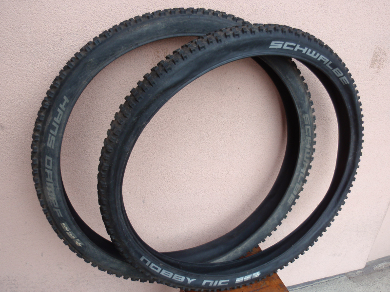 Prodám zánovní pláště Schwalbe Hans Dampf 27.5x2.35 který má cca 98% vzorku a Schwalbe Nobby Nic 27.5x2.25 který má cca 93% vzorku. Cena: 790kč/pár